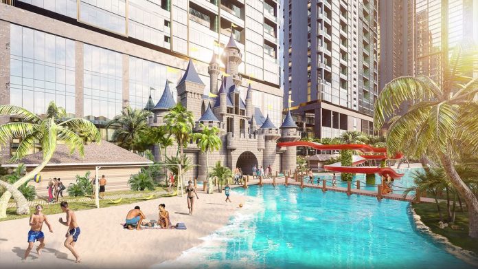 Duới chân các tòa tháp là hệ thống bãi biển trải dài theo nội khu, tại đây con trẻ trải nghiệm thế giới tuổi thơ đa sắc màu khi khám phá mô hình lâu đài cát, mô hình tàu biển, xem trình diễn nhạc nước hiện đại, chơi cầu trượt…