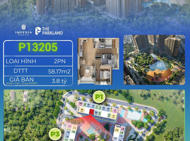 Sản phẩm P1.3205 nằm trong phân khu THE PARKLAND, tòa P1, tầng 32 dự án Imperia Ocean City.