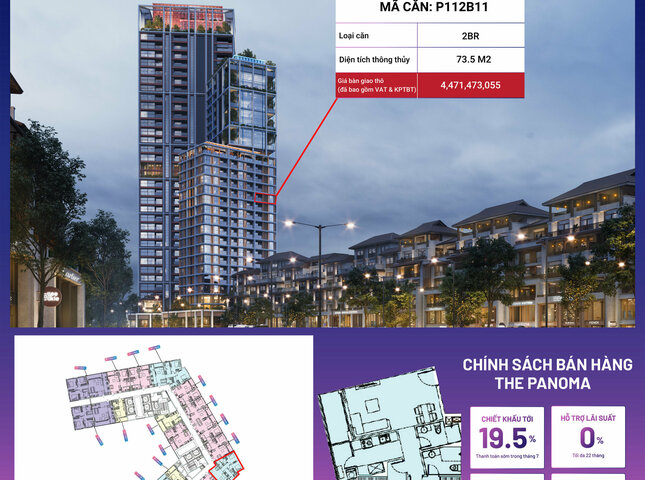 Sản phẩm có Diện tích tim tường là m2 và Diện tích thông thủy là 73,5 m2 .